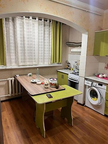 - Кухня с полным набором мебели и техники: газовая плита с духовкой, вытяжка, мойка, стиральная машина, рабочая столешница, навесные и напольные шкафы в зелёных фасадах. Большое окно с двойными шторами (тюль + портьеры), радиатор отопления.