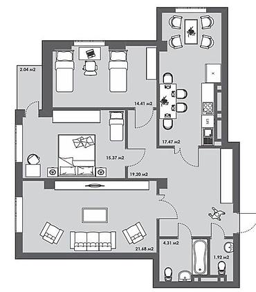 - Две изолированные спальни: 15,37 м² и 14,41 м².