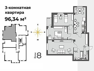 3‑комнатная квартира, 96,34 м², блок 8
