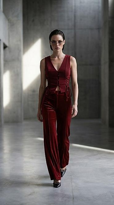 - Демонстрация кроя, посадки и фактуры (например, бархатный костюм, брюки клёш, жилет с шнуровкой).