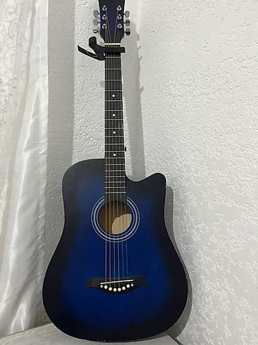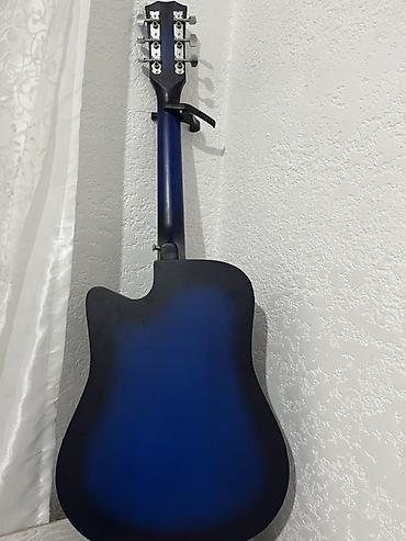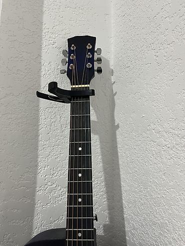 Акустическая гитара типа дредноут с вырезом (cutaway), 6 струн. Корпус сине-черного градиента, матовое покрытие. Классическая круглая розетка с контрастными кольцами. Накладка грифа темная, с точечными метками ладов; 20 ладов. Колковая механика хромированная, открытого типа. Нижний порожек и струнодержатель с белыми пинами. На грифе установлен каподастр. Есть крепежное гнездо для ремня на нижней деке и на пятке грифа.