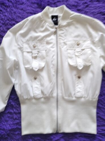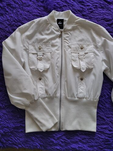 БелыйБелая женская куртка-бомбер( ветровка). Размер М. Подойдёт на девочку подростка. Белый цвет позволяет носить в школе, когда прохладно.