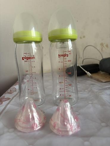 - 2 бутылочки Pigeon по 240 мл (разметка в мл и унциях), узкое горлышко, колпачки защитные с зелёной окантовкой.