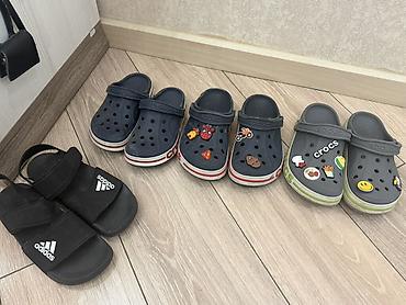 - Пляжные/домашние сабо Crocs тёмно‑синие: несколько пар, черные сандалии Adidas на липучках.