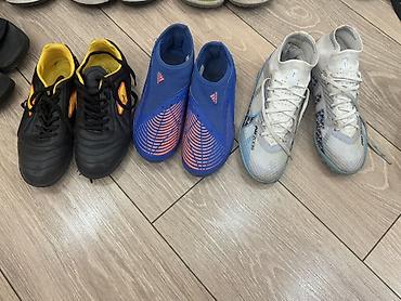 - Футбольные бутсы/сороконожки: черные Lotto с шнуровкой; синие Adidas с носком-носочком; белые Nike с шнурками.