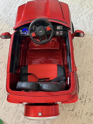 Детский электромобиль, выполненный в стиле Mercedes-Benz G-Class. Модель имеет кузов насыщенного красного цвета и детализированный дизайн, включая фары, решетку радиатора и боковые зеркала. Сиденье...