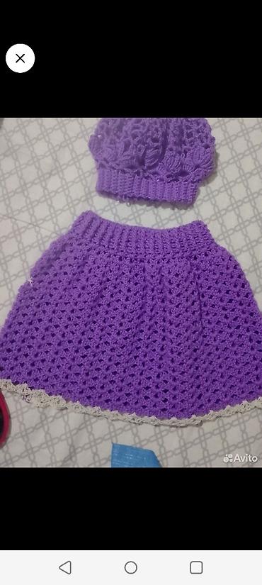 - Фиолетовый комплект: шапочка с объемным узором «листочки» и юбка с ажурным рисунком, эластичный пояс, по низу юбки светлая декоративная обвязка.