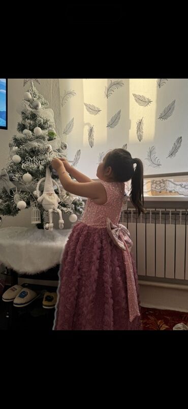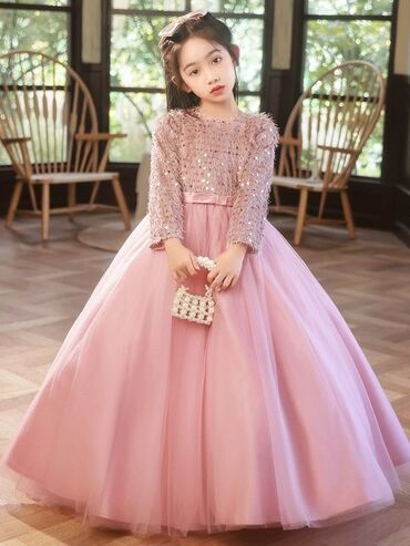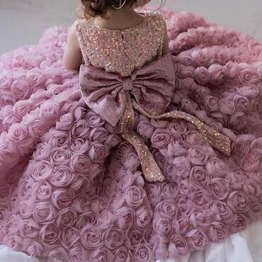 2) Розовое коктейльное с объемной юбкой из 3D-розочек, лиф целиком расшит пайетками; длинный рукав; крупный бант спереди; в комплекте ободок/бант для волос.