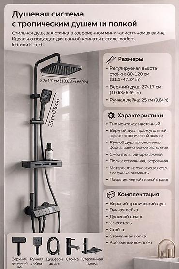 Душевая система с верхним «тропическим» душем и полкой, настенное исполнение. Современный минималистичный дизайн в черном матовом/графитовом покрытии — подходит для ванных в стиле modern, loft, hi‑tech.