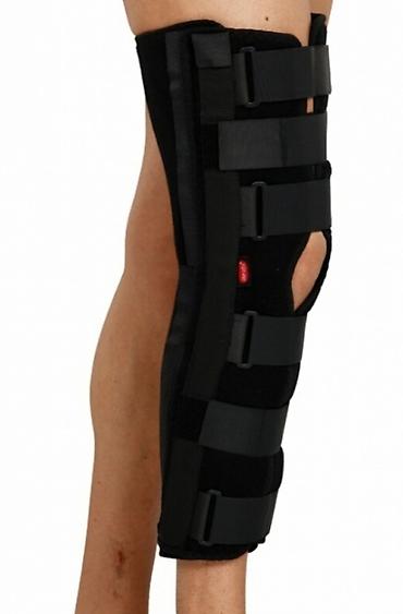 - Жёсткая фиксация колена в разогнутом положении: три продольные металлические/пластиковые шины по бокам и сзади.