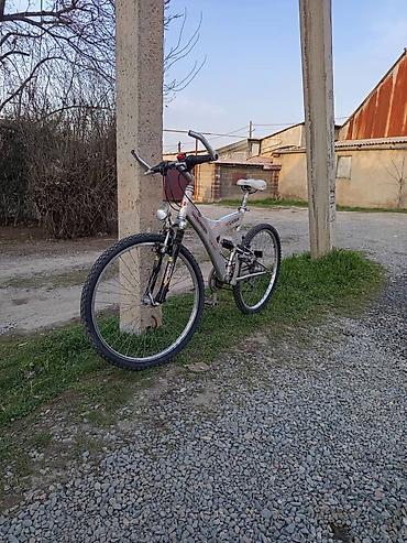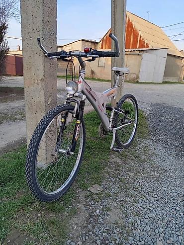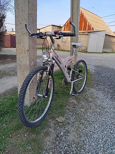 Горный велосипед с амортизатором - Рама: стальная, двухподвес (передняя вилка с ходом и центральный амортизатор на раме) - Колёса: 26", зубастые покрышки для грунта - Тормоза: ободные V‑brake ...