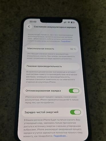 - Показатель «Состояние аккумулятора» на фото — 92%, включены «Оптимизированная зарядка» и «Зарядка чистой энергией».