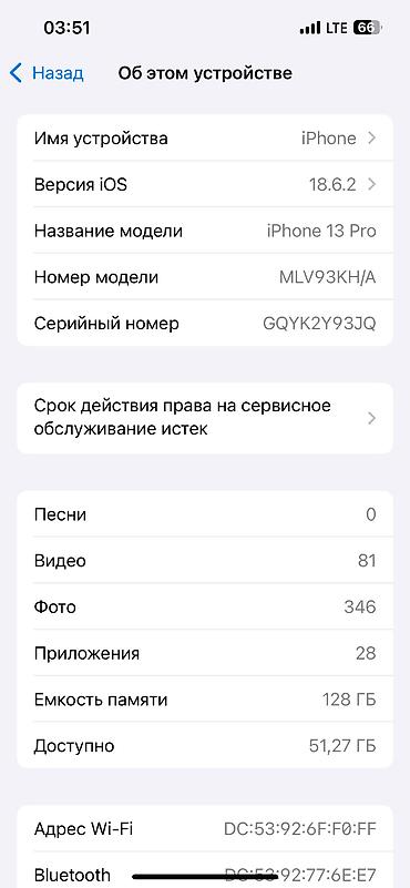 IPhone 13, черный, 128 ГБ. Характеристики и детали по снимкам экрана: - Модель: iPhone 13 (номер модели MLNW3RK/A). - Память: 128 ГБ, доступно ~112,45 ГБ. - iOS: 18.2. - Серийный номер виден на ск...