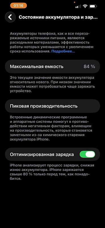 - Аккумулятор: максимальная емкость 84%, оптимизированная зарядка включена.