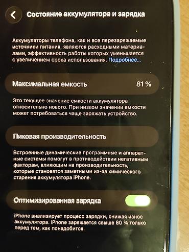 - Аккумулятор: максимальная ёмкость 81% (скриншот «Состояние аккумулятора и зарядка»), активна «Оптимизированная зарядка»