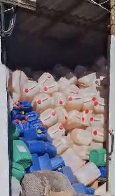 - В наличии как пустая тара, так и заполненные канистры с темной технической жидкостью (по фото — масло/топливо; состав уточняется маркировкой на таре).