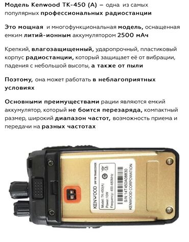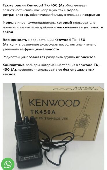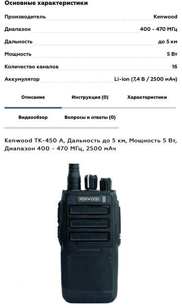 Доставка бесплатно по городу Бишкек Рация Kenwood TK-UVF8 (Dual Band FM Transceiver) Основные возможности: - Двухдиапазонная работа: VHF/UHF (dual band) - Два одновременных канала на экране (dual...