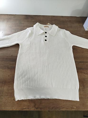 Белый трикотажный джемпер-поло с длинным рукавом.