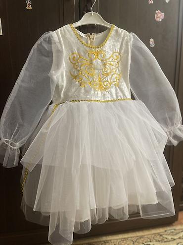 Нарядное детское платье белого цвета На 7-8 лет - Стиль: праздничное/сценическое, пышная юбка. - Верх: сатиновый лиф с мягким блеском, отделка по линии плеч пушистым тюлем/перьями-воланами. - Юбка...
