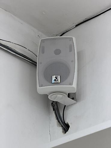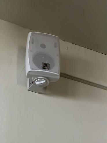 Комплект для фонового звука/оповещения: стереоусилитель с микрофонным входом + настенные акустические системы.