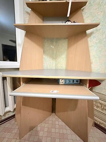 - Конструктив: угловая тумба-стол с широкой рабочей поверхностью и двумя верхними полками-надстройками; задняя стенка частично закрыта декоративной панелью.