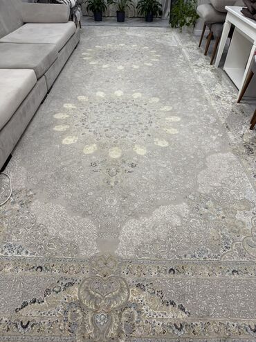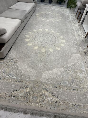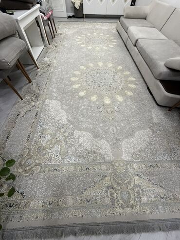 - Цвет: светло‑серый с бежево‑кремовыми узорами и медальонами, классический восточный орнамент, декоративная кайма, короткая бахрома по краям