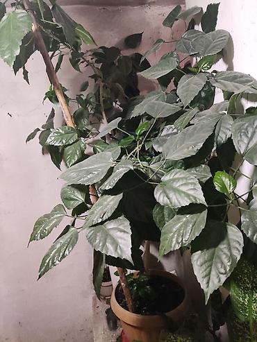 Крупный комнатный гибискус (Hibiscus rosa‑sinensis) в напольном горшке.