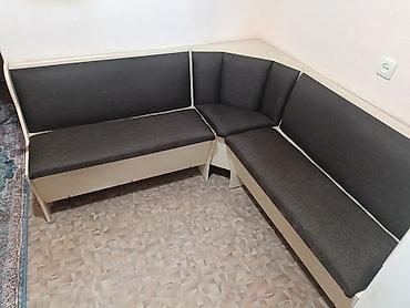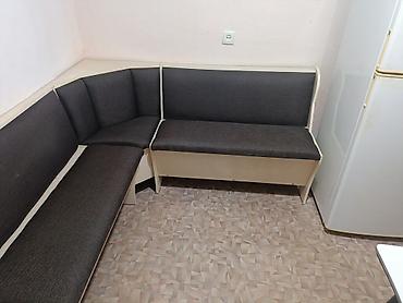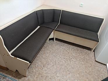 Кухонный уголок с обеденным столом и табуретами. Состав комплекта: - Прямоугольный стол из ЛДСП с закруглёнными углами и фигурными опорами. - Две угловые скамьи/лавки с мягкими спинками и сиденьям...