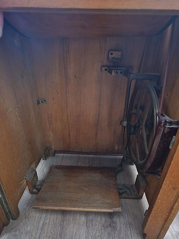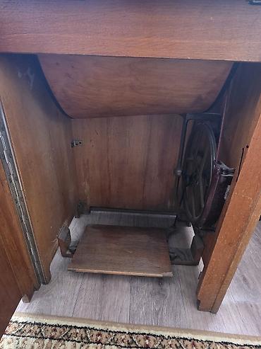 - Установлена в деревянный шкаф-стол с крышкой: при закрытии машина прячется внутрь, сверху образуется ровная поверхность.