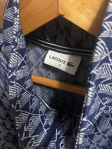 Lacoste с геометрическим принтом. Модель выполнена в темно-синем цвете с повторяющимся белым узором. Куртка имеет воротник-стойку, застежку-молнию по всей длине и эластичные манжеты и низ. На рукавах расположены контрастные полосы. Фирменный логотип Lacoste в виде крокодила находится на груди. Подходит для повседневной носки, занятий спортом или создания стильного образа.