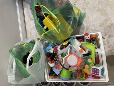 - Две большие пакеты с дополнительными игрушками и аксессуарами (в том числе крупные пластиковые детали, конструкторные элементы, машинки и др.).