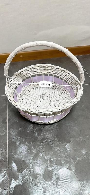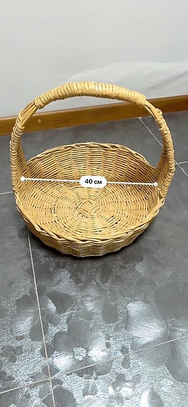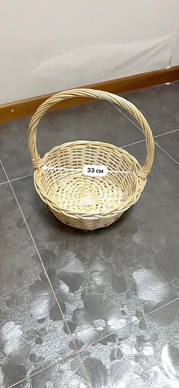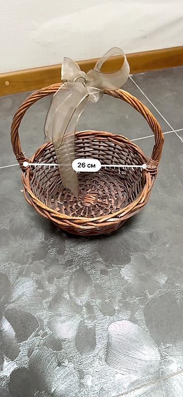 1) Круглая тёмная корзина с декоративным бантом на ручке — диаметр дна около 26 см.