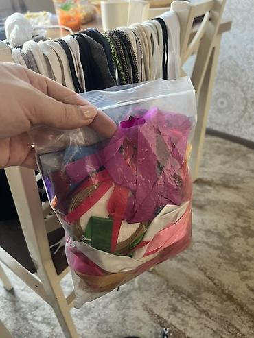- Пакет разноцветных лент и тесьмы (атласные, капроновые и др.) — розовые, фиолетовые, белые, зелёные, золотистые, красные и т.д., разные ширины и отрезки.