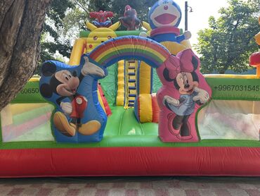 НадувнойАРЕНДА! Большой многофункциональный надувной батут в ярких цветах, украшенный изображениями популярных персонажей мультфильмов, таких как Микки Маус, Минни Маус и Пикачу. Батут включает в себя две горки разной высоты, лестницу для подъема, а также различные надувные элементы для игр и лазания. Конструкция предлагает несколько зон для активного времяпровождения, обеспечивая безопасность благодаря надувным стенкам и мягким поверхностям. Идеально подходит для детских мероприятий на открытом воздухе, праздников или коммерческого использования в парках развлечений.