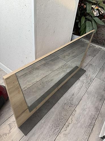 - Конструкция: стеклянное зеркало, закреплённое на панели под дерево; снизу — выступающая опорная планка/полка из материала под камень (серый)