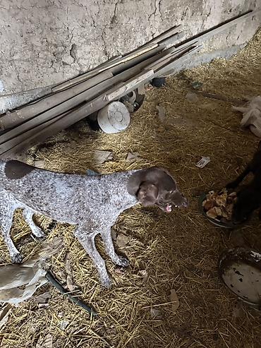 - Окрас: крапчатый с крупными коричневыми подпятнами; есть собака сплошного коричневого окраса.