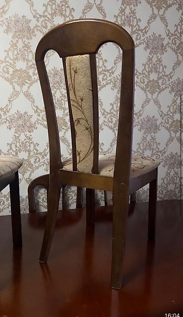 - Стулья в едином стиле: деревянный каркас, высокая фигурная спинка с декоративной вставкой, мягкое сиденье с светлой жаккардовой обивкой с растительным узором.