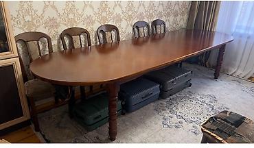 СРОЧНО ПРОДАЮ СТОЛ! Со стуляьми Длина 2,5м в раскладком виде ширина 1 м Обеденная группа: раскладной стол + 8 стульев - Материал: массив/шпон, натуральное дерева Кара Жыгач (лакированная поверх...