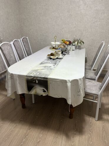 - Размеры ориентировочные: рассчитан на 6–8 персон (по фото — шесть стульев по периметру, остаётся место по торцам).