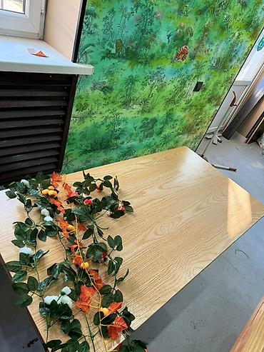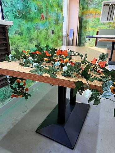 - Размеры по фото: приблизительно формат «двухместный/четырёхместный» (ориентировочно 120×70 см; визуальная оценка). Подходит для кафе, баров, столовых зон в офисе и дома.