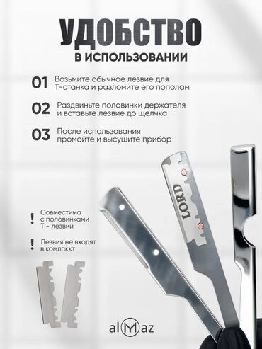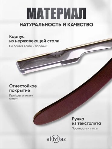 Опасная бритва almaz (shavette) - Материал и конструкция: - Корпус из нержавеющей стали — не боится влаги и падений. - Огнестойкое покрытие металлических частей. - Рукоять из текстолита: про...