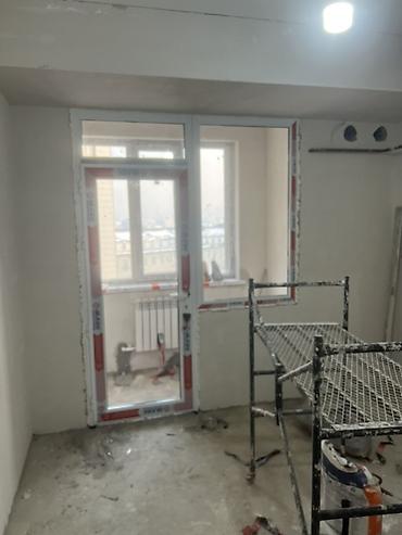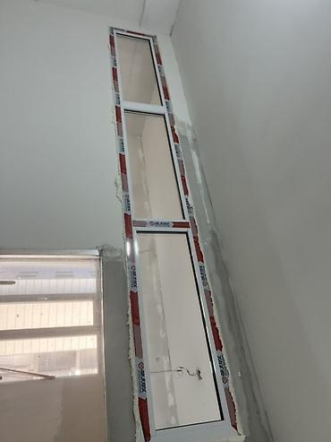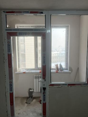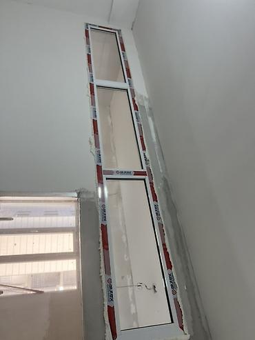 - Балконный блок: ПВХ-дверь с остеклением + глухое боковое окно в одной раме. Узкий импост, светлый профиль с уплотнителями. Дверное полотно с поворотной фурнитурой и стеклопакетом, подготовлены четкие монтажные швы под последующую отделку.