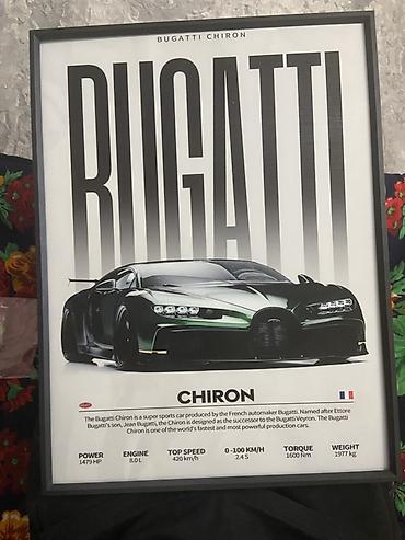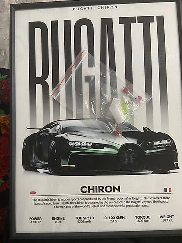 - Настенная картина-постер с изображением гиперкара Bugatti Chiron и крупной надписью “BUGATTI”.