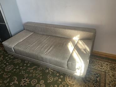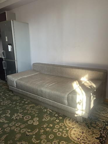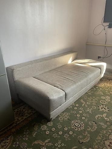 Раскладной диван. Серый диван-кровать с тканевой обивкой, оснащенный механизмом трансформации для создания дополнительного спального места. Модель имеет встроенный ящик для хранения белья, что позв...