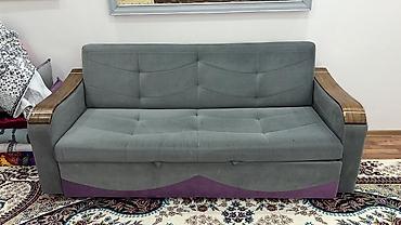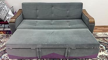 Раскладной диван серого цвета с функциональностью спального места. Обивка выполнена из текстурированного материала, имитирующего замшу или велюр, что придает ему стильный вид и приятную на ощупь по...