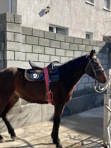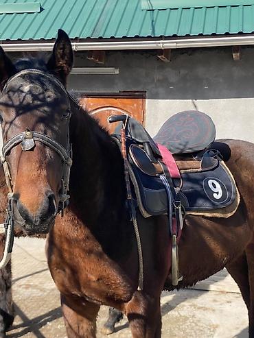 Продаётся лошадь (темно-гнедая масть) с полным комплектом амуниции для верховой езды: - уздечка с повodом и капсюлем; - седло с подпругой и потником; - подпружные ремни, стремена; - ногавки/бинты н...