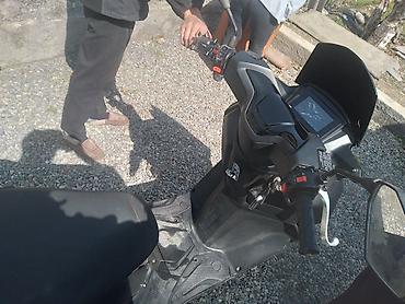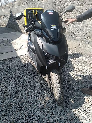 - Кузов: городской максискутер в чёрном цвете с высоким ветровым стеклом.