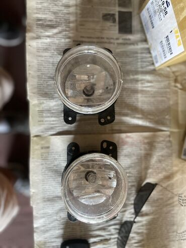 Пара автомобильных противотуманных фар, предназначенных для улучшения видимости в условиях тумана, дождя или снегопада. Каждая фара имеет прозрачный корпус и встроенные лампы, обеспечивающие направ...