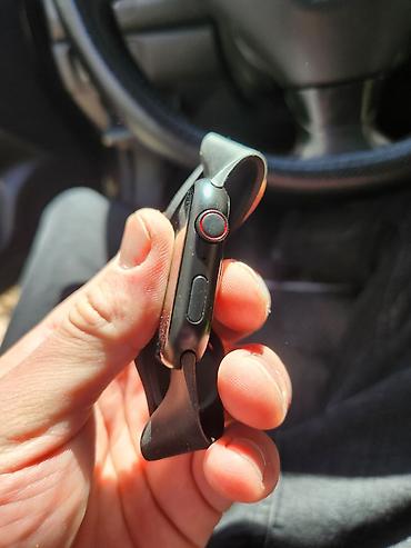 - Корпус с закругленными краями, боковая кнопка и колесико Digital Crown с красным ободком.