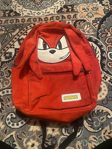 Рюкзак тематический Sonic — красный, мягкий плюшевый материал. На фронтальной панели — большой персонаж Knuckles с длинными ушками-лапками, ниже нашивка SONIC.